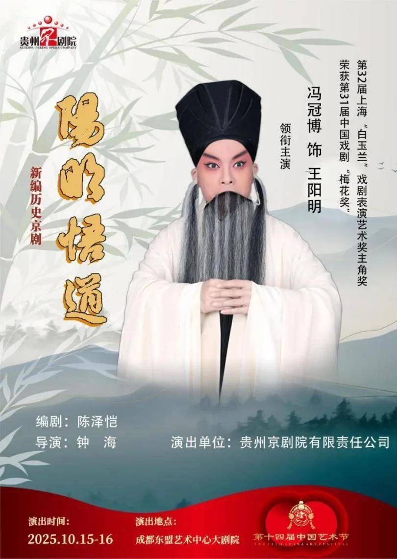 由文化和旅游部、重庆市东说念主民政府、四川省东说念主民政府归并主持的第十四届中国艺术节将于10月15日至11月5日在川渝两地举办。贵州京剧院创作的新编历史京剧《阳明悟说念》将于10月15日、16日在成皆东盟艺术中心大剧院上演,角逐第十八届文采奖。该剧由一级编剧陈泽恺握管,中国话剧协会副主席钟海执导,中国戏剧梅花奖、上海白玉兰戏剧饰演艺术奖主角奖得回者冯冠博领衔主演。